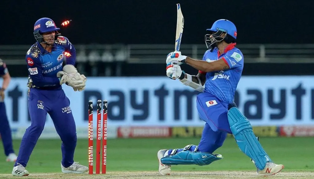 चौथो ओभरको तेस्रो बलमा स्पिनर जयन्त यादवले अर्का ओनपर शिखर धवनलाई १५ रनमा बोल्ड आउट गरे । धवनले १३ बलमा ३ चौका प्रहार गरे । धवन आउट हुँदा दिल्ली २२–३ को कमजोर अवस्थामा पुगेको थियो । कप्तान श्रेयस ऐर १४ र विकेटकिपर ऋषभ पन्त ४ रनमा खेलि रहेका छन् । बोल्टले ३ ओभरमा २४ रन खर्चेर २ विकेट लिएका छन् ।