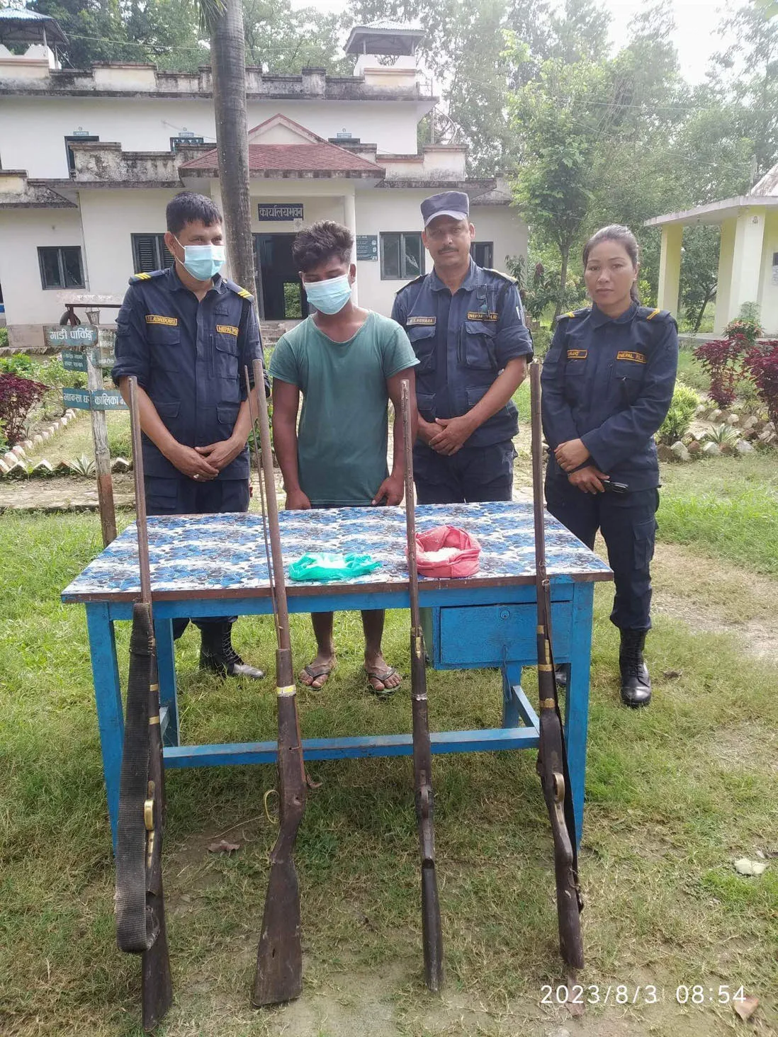 धनगढी– ४ थान भरुवा बन्दुक सहित कैलालीको गौरीगङ्गा नगर पालिकाबाट १ जनालाई प्रहरीले पक्राउ गरेको छ । गौरीगगां –६ दैद्वारी शिविर बस्ने २० वर्षीय सागर चौधरी लाई पक्राउ गरिएको जिल्ला प्रहरी कार्यालय कैलालीका प्रवक्ता प्रहरी नायब उपरिक्षक कुल दीप चन्दले बताए । स्थानीय प्रदेशु चौधरीको घरमा अवैध घरेलु हतियार भरुवा बन्दुक लुकाई छिपाई राखिएको छ भन्ने विशेष सूचनाको आधारमा खानतलासी गर्दा माटाको धान राख्ने भकारी भित्र लुकाई छिपाई राखिएको अवस्थामा एकनाले भरुवा बन्दुक ४ थान फेला परेको हो । बन्दुक सँगै त्यसमा प्रयोग हुने कच्चा पदार्थ सुरा ३ सय ग्राम र गन्धक १३० ग्राम बरामद गरिएको प्रहरी नायब उपरिक्षक चन्दले जानकारी दिए । पक्राउ परेका सागर प्रदेशुका छोरा हुन । घटना बारे थप अनुसन्धान भइरहेको प्रहरीले जनाएको छ ।