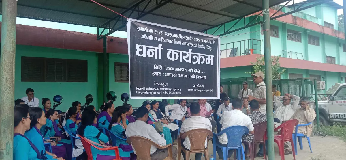 हाजिर गर्न नपाएका स्वास्थ्यकर्मी सोमबारबाट धनगढी उपमहानगरपालिका परिसरमा धर्नामा बसेका छन् । समायोजन मिलान भइआएका कर्मचारीलाई उपमहानगरपालिकामै काम गर्न दिइयोस् भन्ने आफूहरूको माग रहेको कृष्णबहादुर बोहराले बताउनुभयो ।