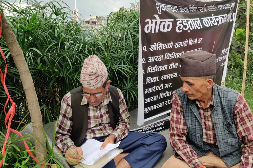 आरक्ष पीडित संघर्ष समितिका अध्यक्ष कर्णबहादुर चन्द र सचिव प्रेमदत्त भट्टसहित पीडितहरु पुनर्स्थापनाका लागि पाँच बुँदे मागसहित भोक हड्तालमा बसेका हुन् ।