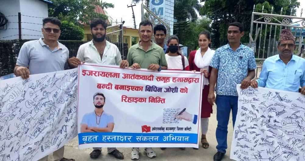 कञ्चनपुर– ३१५ दिनदेखि प्यालेस्टाइनी विद्रोही लडाकु समूह हमासले बन्धक बनाइ राखेका कञ्चनपुरका विद्यार्थी विपिन जोशीको सकुशल रिहाइको माग गर्दै सुदूरपश्चिम विश्वबिद्यालयको केन्द्रिय क्याम्पसका विद्यार्थीहरुले शुक्रबारदेखि बृहत हस्ताक्षर संकलन अभियान सुरु गरेका छन् । अनेरास्ववियुको अगुवाइमा जोशीको रिहाइका लागि कुटनीतिक पहल गर्न सरकारालाइ दबाव दिने उद्देश्यले सुदूरपश्चिमका ९ वटै जिल्लाका क्याम्पसहरुमा हस्ताक्षर संकलन अभियान सुरु गरिएको आयोजक विद्यार्थी संगठनले जनाएको छ ।