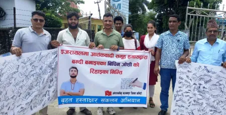 कञ्चनपुर– ३१५ दिनदेखि प्यालेस्टाइनी विद्रोही लडाकु समूह हमासले बन्धक बनाइ राखेका कञ्चनपुरका विद्यार्थी विपिन जोशीको सकुशल रिहाइको माग गर्दै सुदूरपश्चिम विश्वबिद्यालयको केन्द्रिय क्याम्पसका विद्यार्थीहरुले शुक्रबारदेखि बृहत हस्ताक्षर संकलन अभियान सुरु गरेका छन् ।